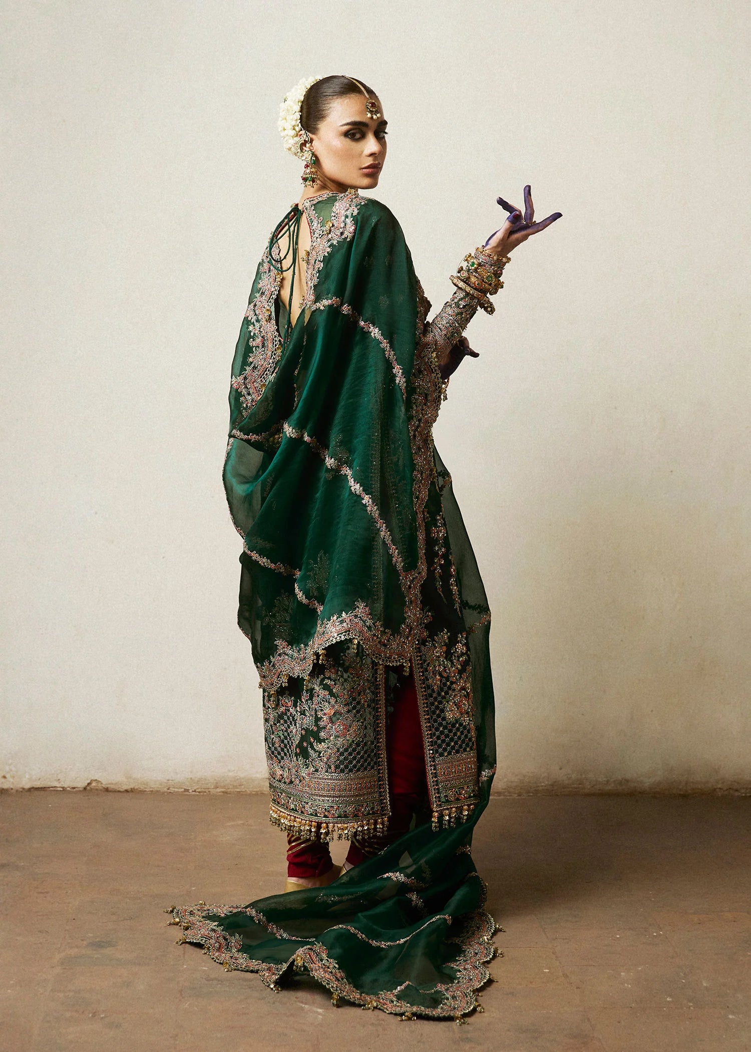 The formal outfit is made of embroidered and embellished organza long shirt, giving it a luxurious and intricate look. The trousers are maroon korean raw silk, giving a traditional look. And dupatta is adorned with diagonal embroidered lines with four side scalloped borders, featuring beautiful designs, and it's complemented by the four side embroidered borders. This outfit is a perfect blend of traditional and contemporary elements.