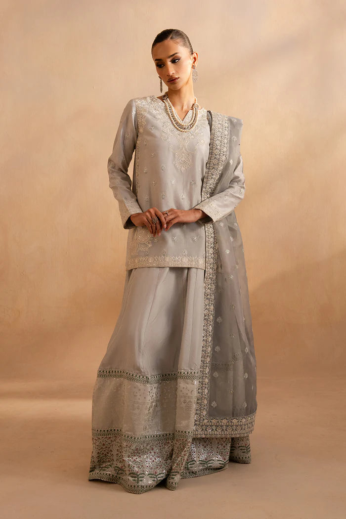 Step into sophistication with this 3-piece pret in a serene Cool Grey hue, featuring an exquisitely tailored Organza Silk shirt and trouser duo. Finished with a sheer Organza dupatta, it’s the epitome of graceful modernity.