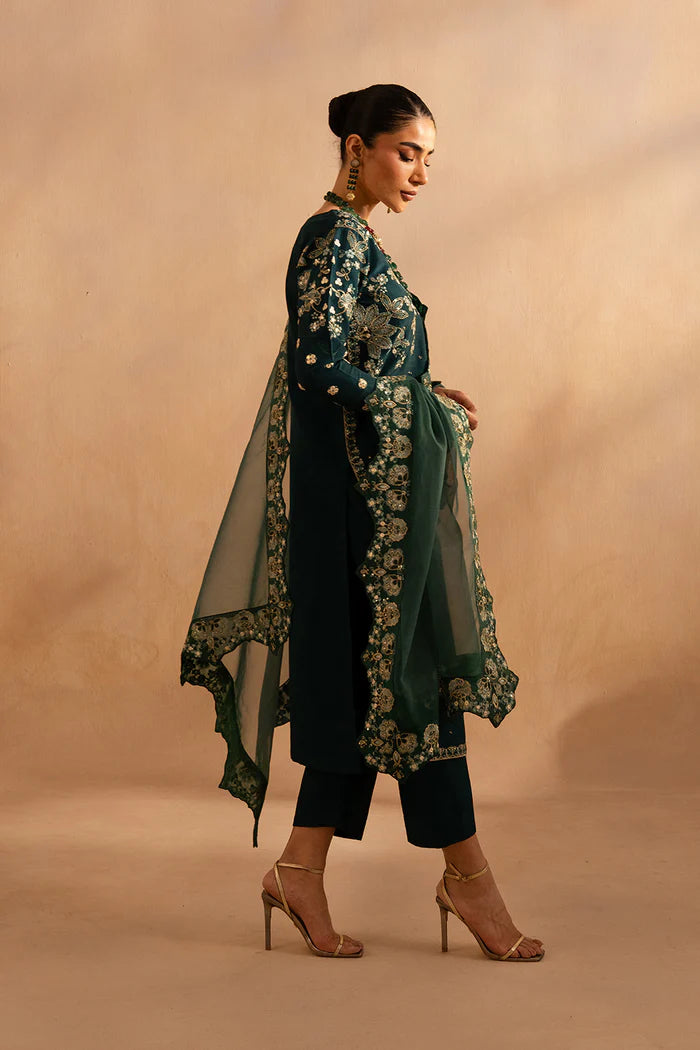 In the deep elegance of Pine Grove, this 3-piece set is a vision of modern grace. The boat neck straight shirt, crafted from Korean silk, shimmers with tilla and sequin embroidery at the neckline and sleeves, while an all-over sequin spray adds subtle sparkle. Fitted sleeves with hidden zips and organza-detailed cuffs offer a refined touch. Paired with matching fitted trousers in plain Korean silk and a perfectly tailored fit. The ensemble is completed by a same-tone organza dupatta, finished with scalloped embroidered borders on all four sides, quietly luxurious and effortlessly chic.