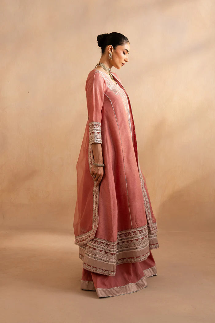 Make a graceful statement in Salmon Pink with this 3-piece pret outfit, featuring a Korean Raw Silk and Organza shirt, complemented by a sleek Plain Grip trouser. The sheer Organza dupatta adds the perfect hint of sophistication to your look.