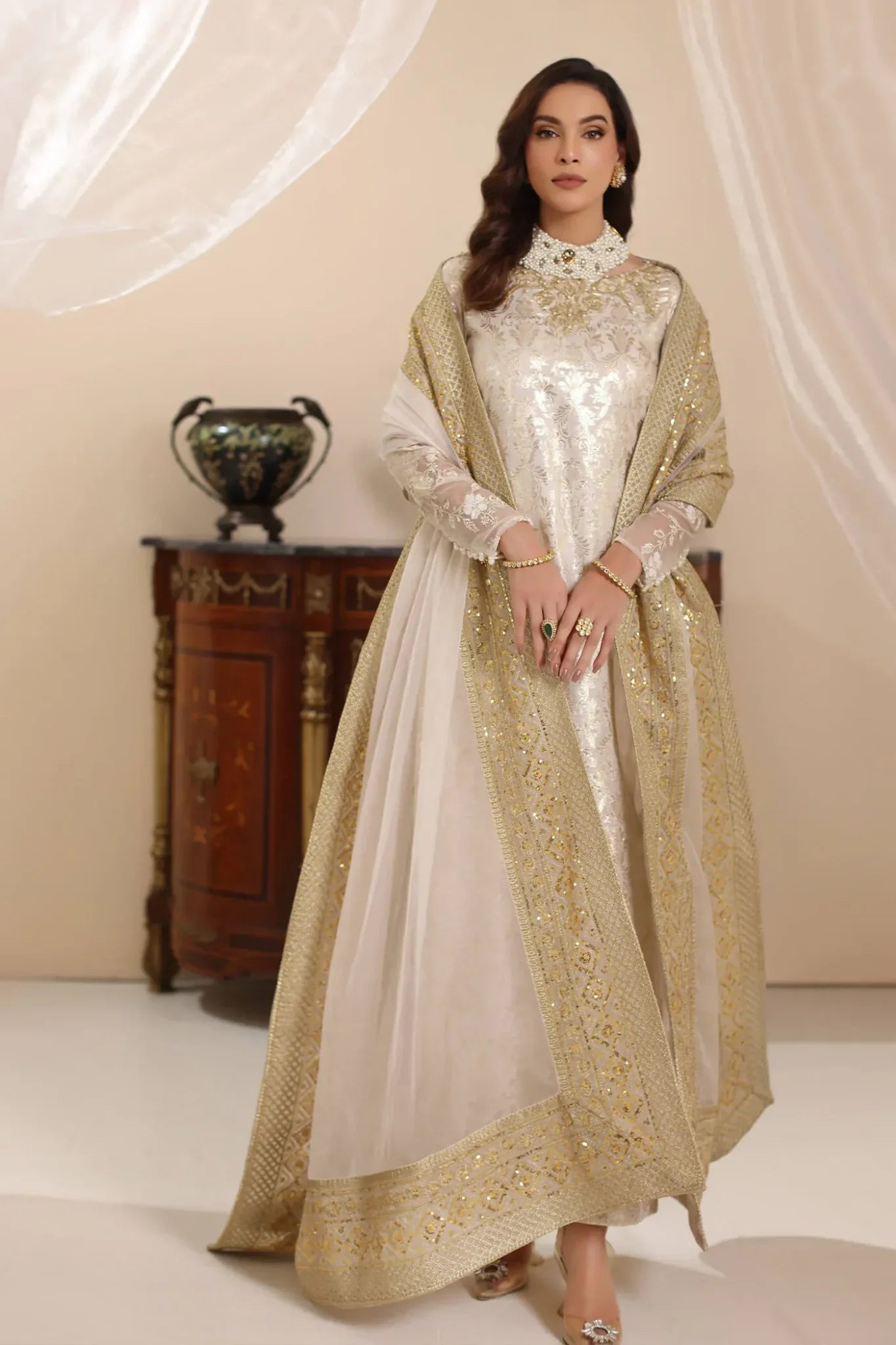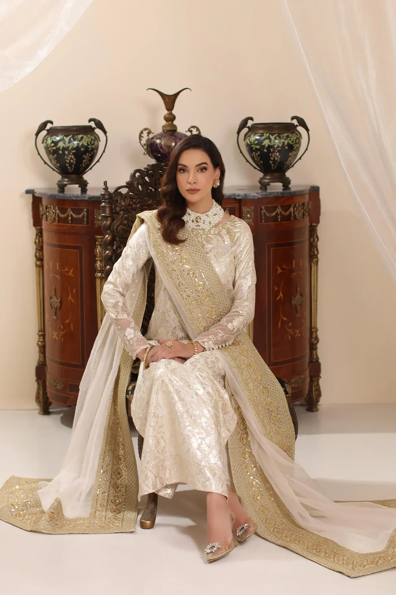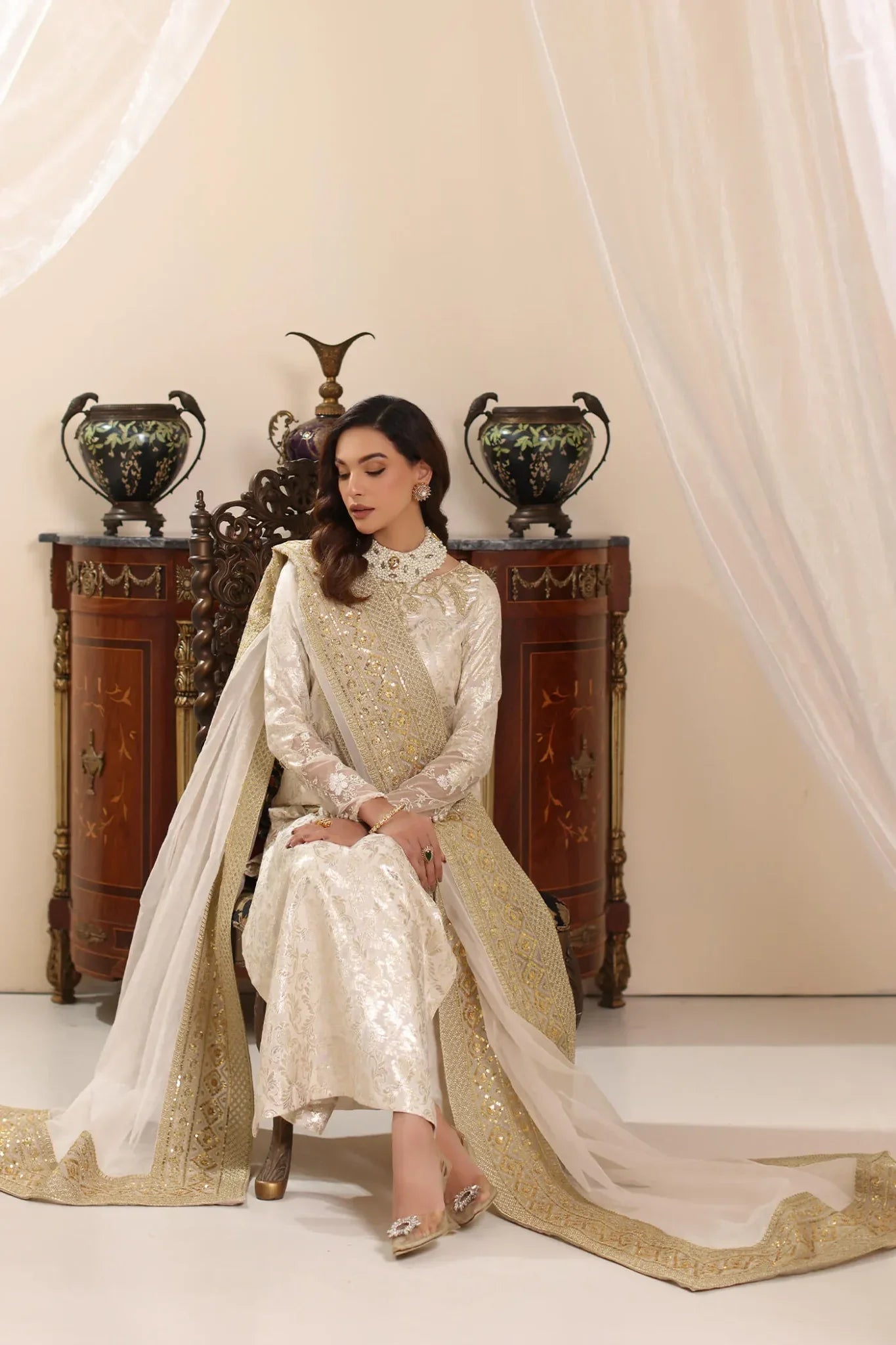 Exuding sophistication, ivory stardust is a vision of grace and elegance. The intricately embroidered tilla neckline is further enhanced with heavy pearl embellishments, creating a luxurious statement. Musferah Saad’s meticulous research into the iridescent beauty of pearls inspired the soft, luminous tones of this ensemble, seamlessly integrating the richness of pearls into the color palette. By infusing her deep understanding of these natural gems, Musferah crafted a unique shade that complements the opulence of the design. Paired with sleek tapered pants, this ensemble achieves a perfect balance of modern style and timeless charm. The organza dupatta, adorned with a four-sided tilla border, adds a touch of ethereal beauty, making this outfit a flawless choice for any occasion.