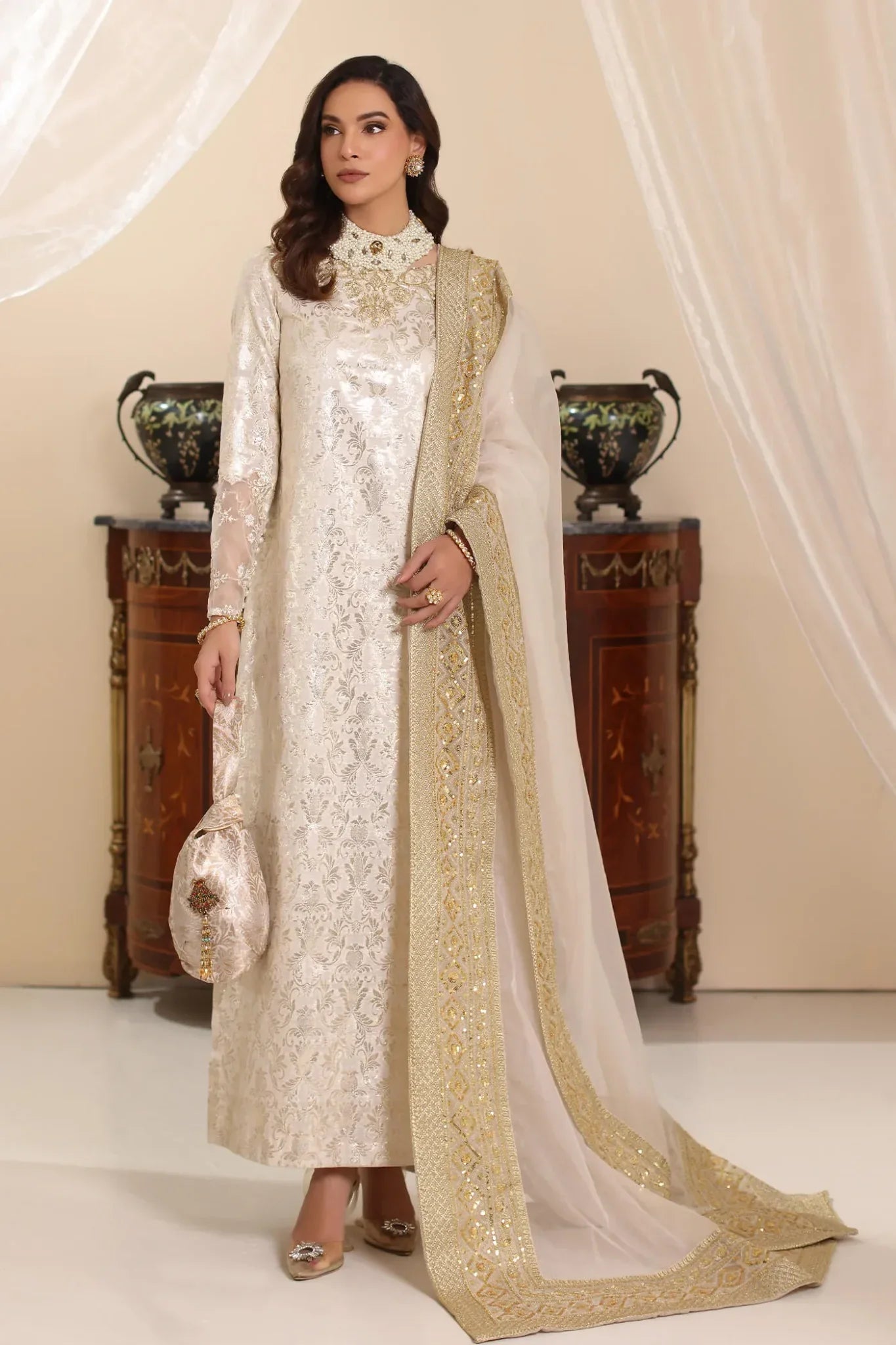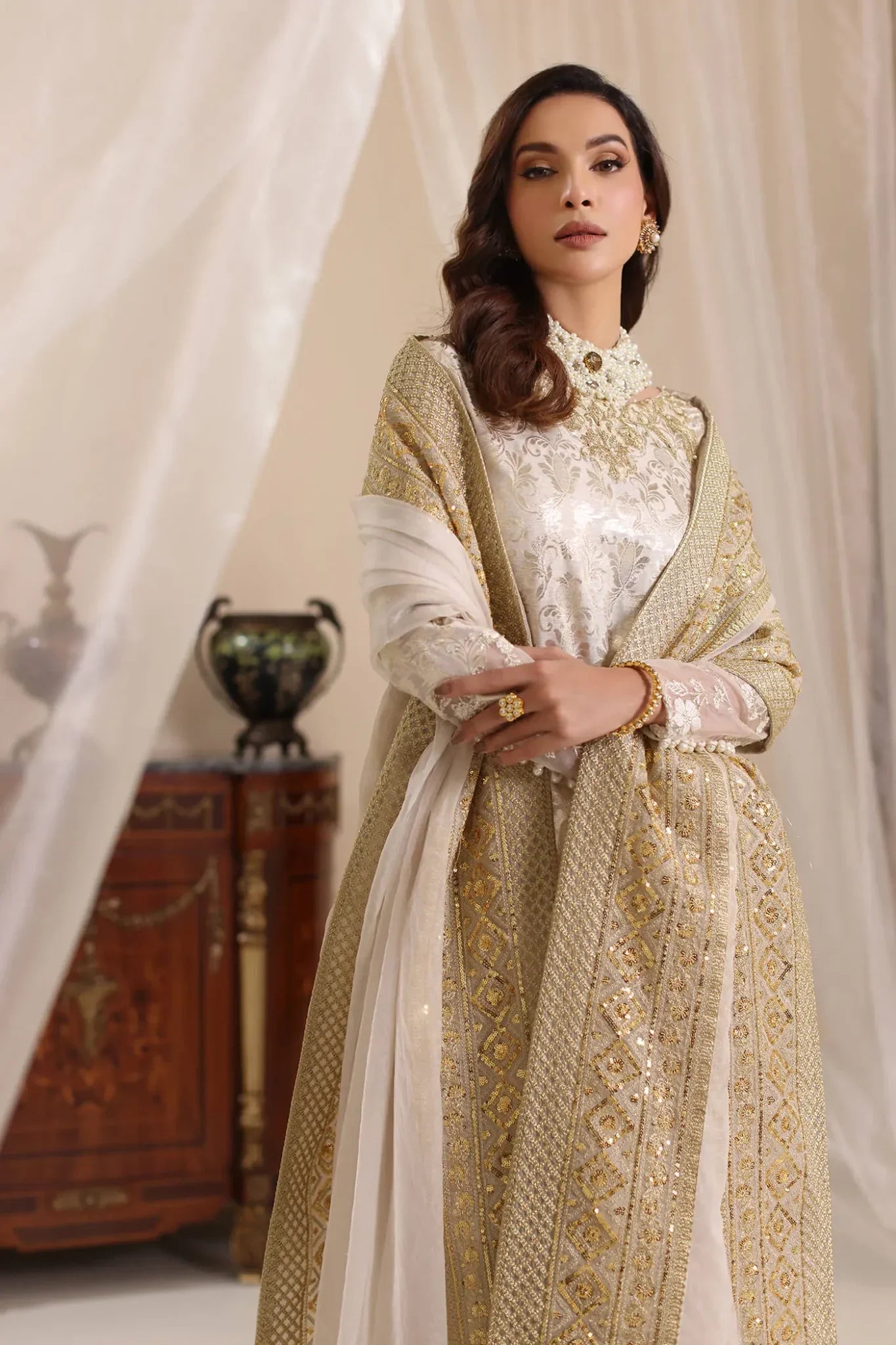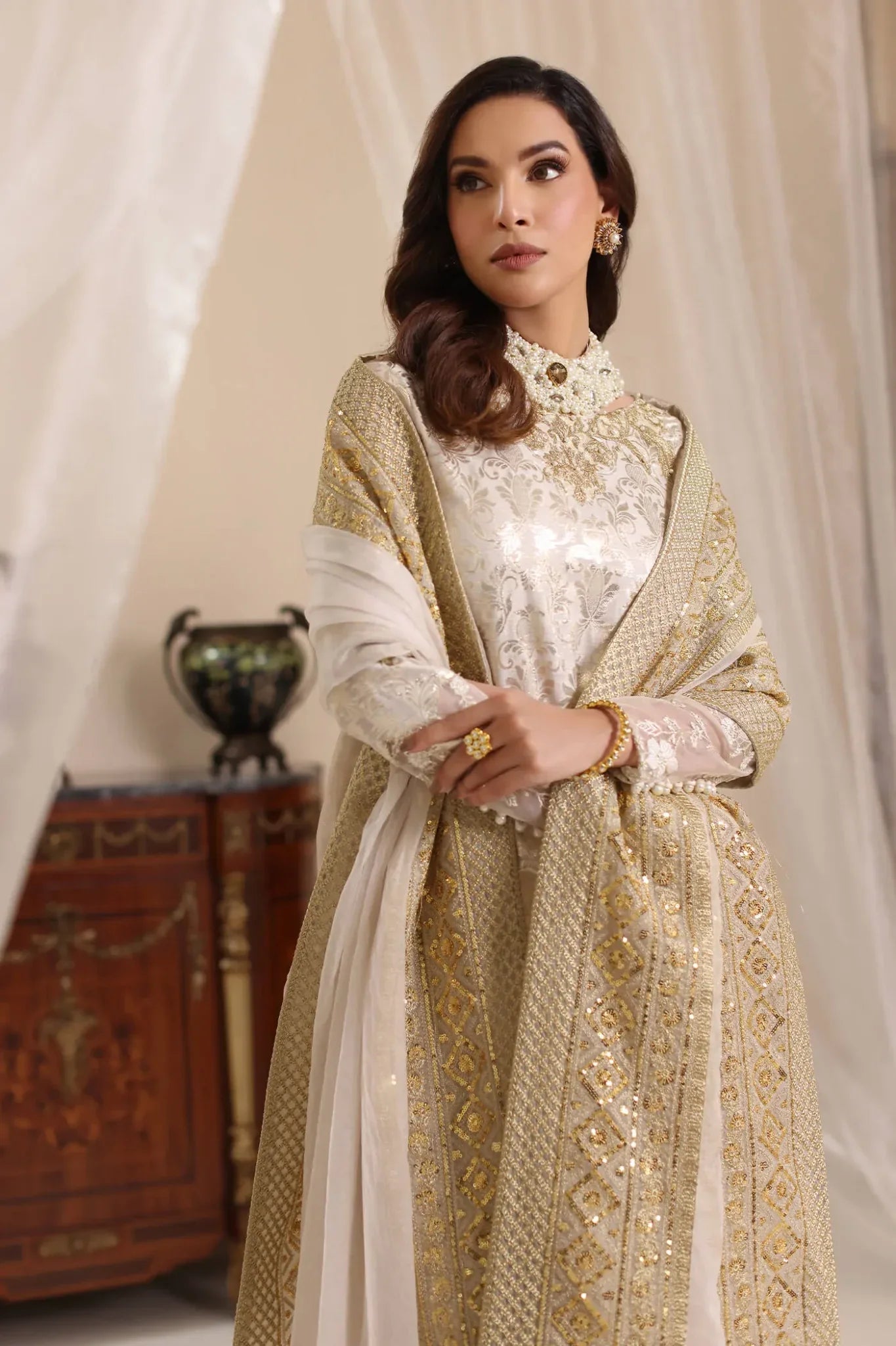 Exuding sophistication, ivory stardust is a vision of grace and elegance. The intricately embroidered tilla neckline is further enhanced with heavy pearl embellishments, creating a luxurious statement. Musferah Saad’s meticulous research into the iridescent beauty of pearls inspired the soft, luminous tones of this ensemble, seamlessly integrating the richness of pearls into the color palette. By infusing her deep understanding of these natural gems, Musferah crafted a unique shade that complements the opulence of the design. Paired with sleek tapered pants, this ensemble achieves a perfect balance of modern style and timeless charm. The organza dupatta, adorned with a four-sided tilla border, adds a touch of ethereal beauty, making this outfit a flawless choice for any occasion.