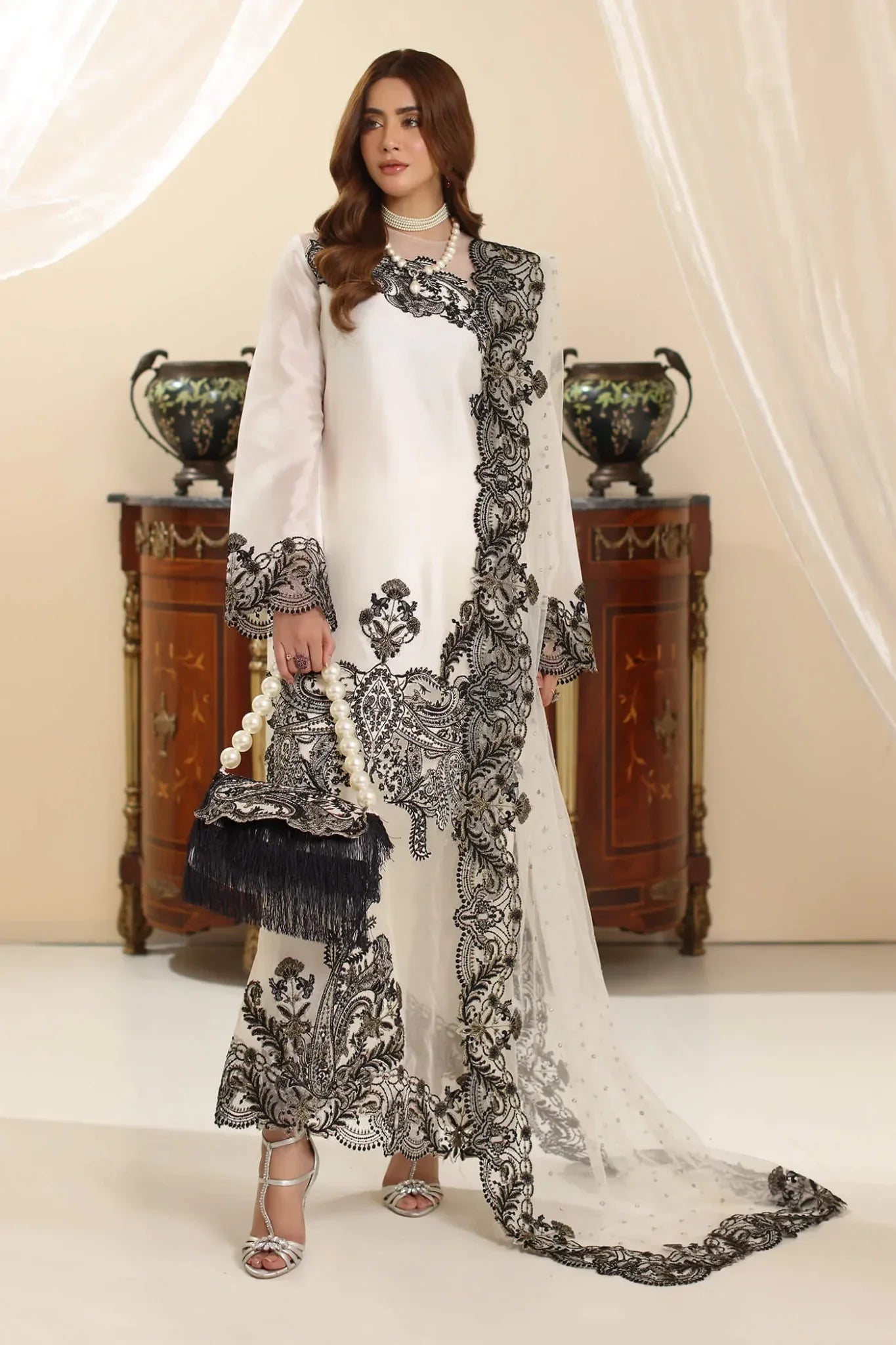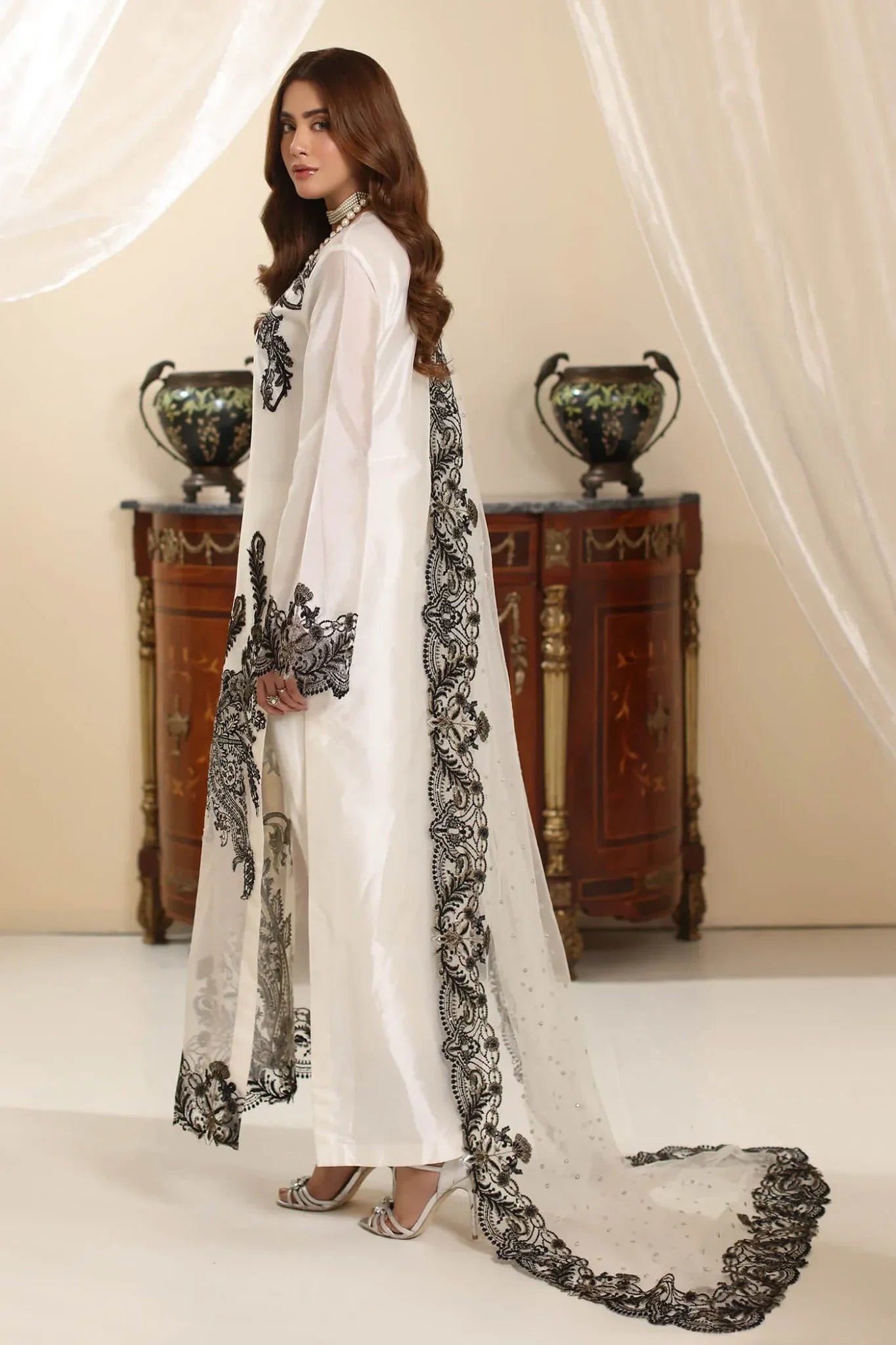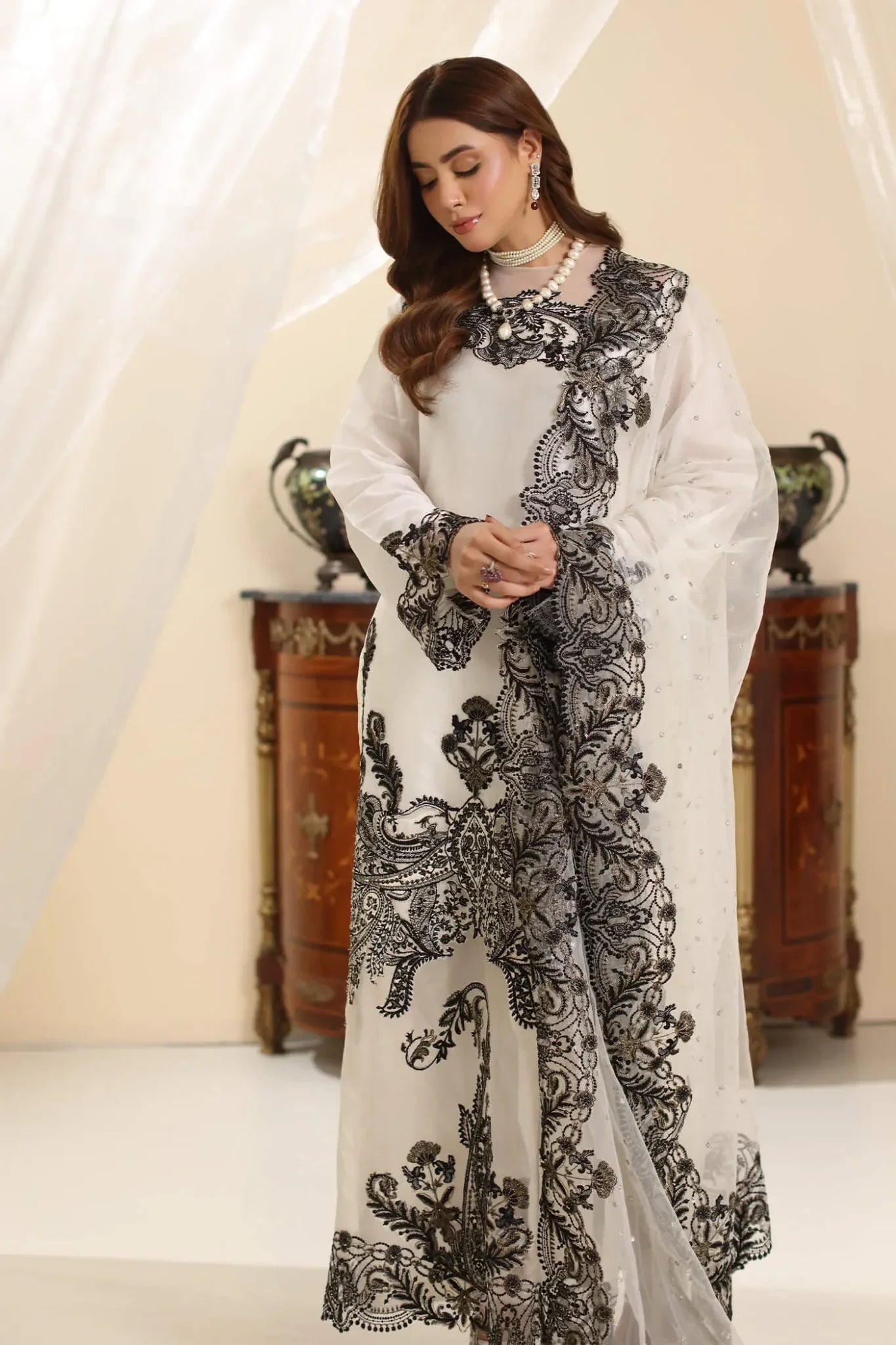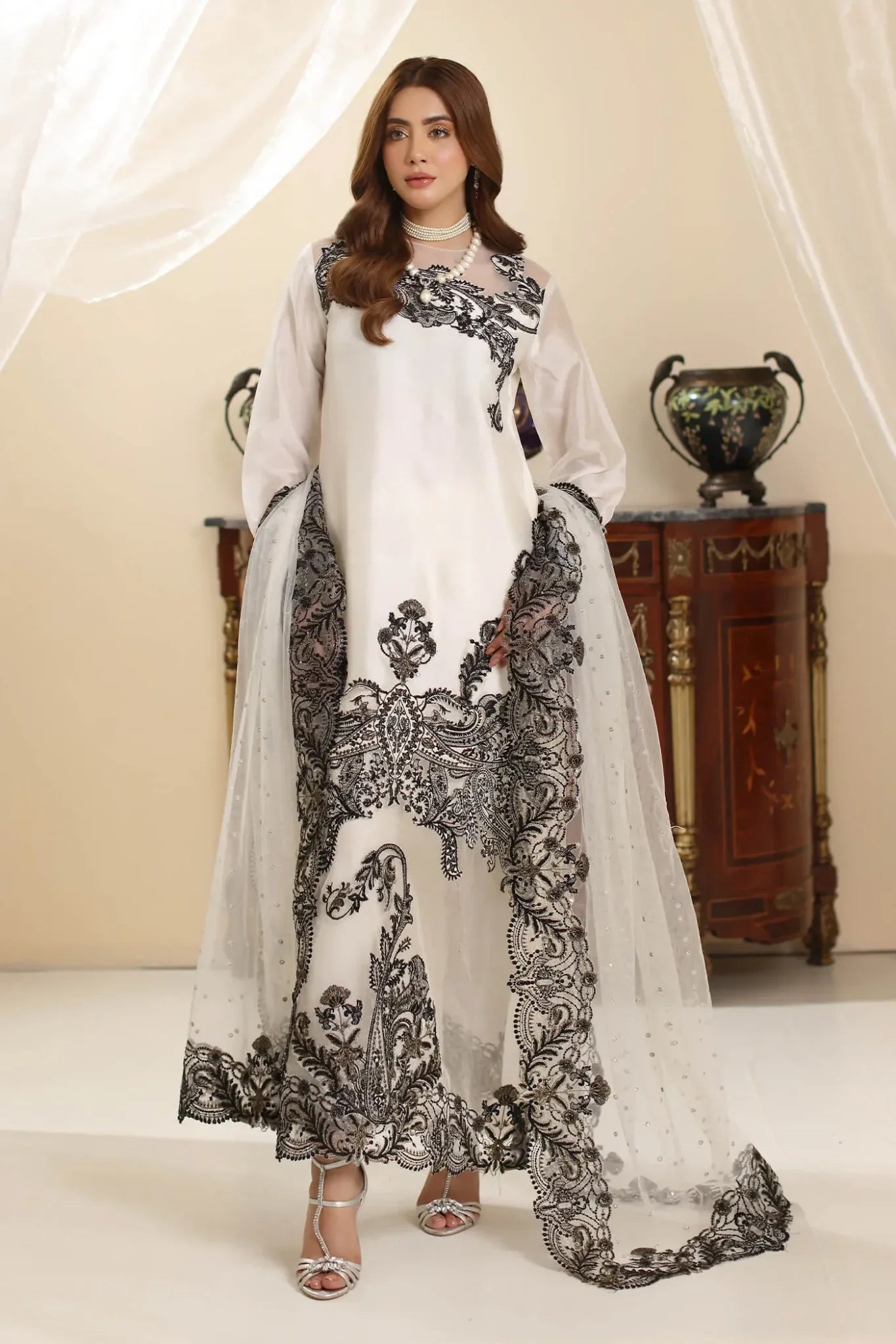 A symphony of black and white comes together seamlessly in this stunning ensemble, showcasing a radiant blend of abstract floral embroidery. Crafted from tissue silk, the outfit is adorned with exquisite tilla embroidery and opulent embellishments, adding a touch of glamour and sophistication. Musferah Saad has styled this elegant piece with tapered pants featuring an embroidered border and paired it with a captivating net dupatta. This combination perfectly embodies the timeless elegance of Musferah Saad’s collection.