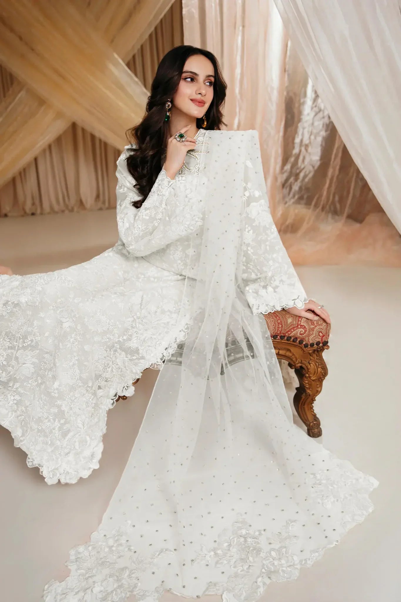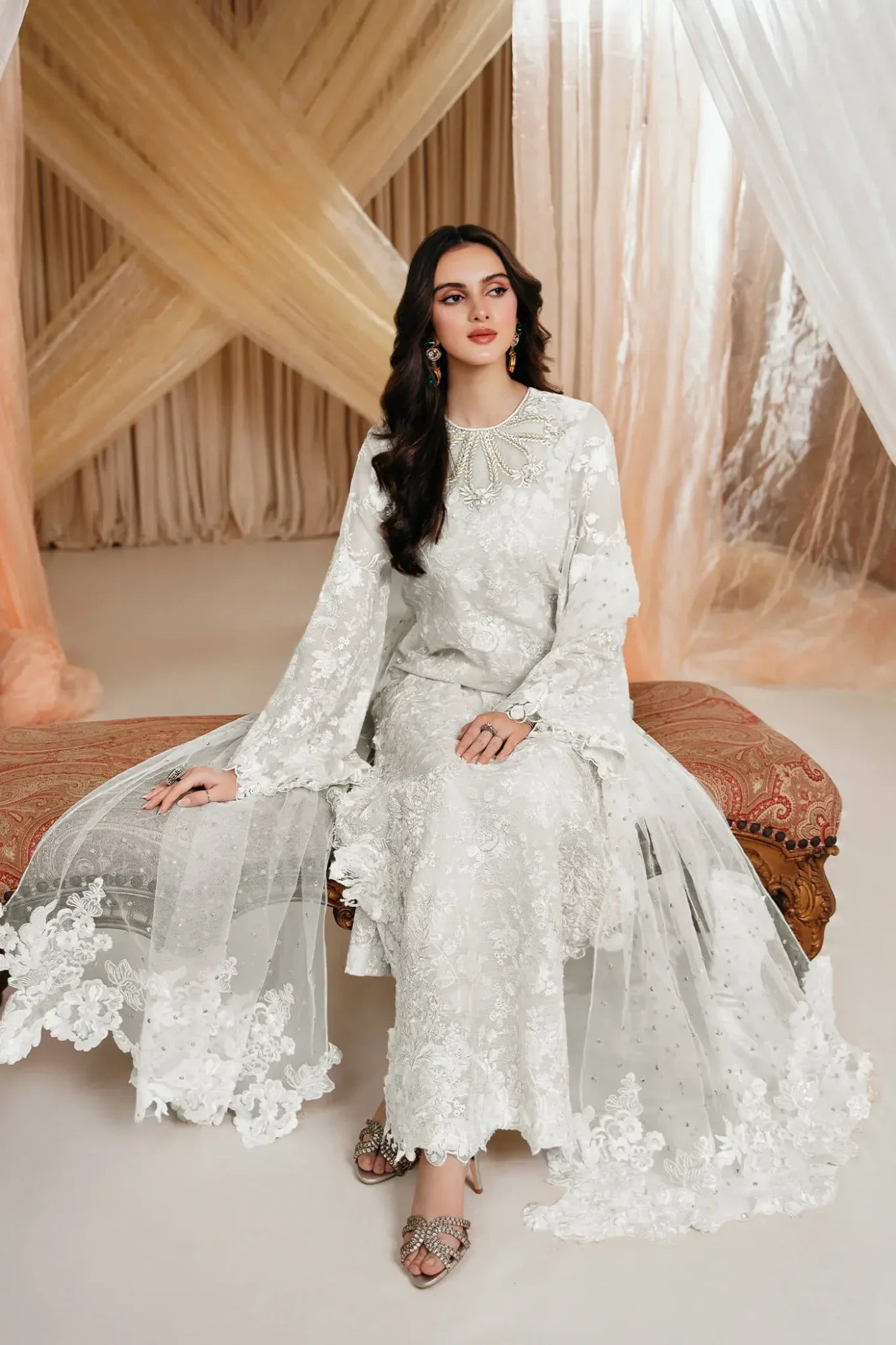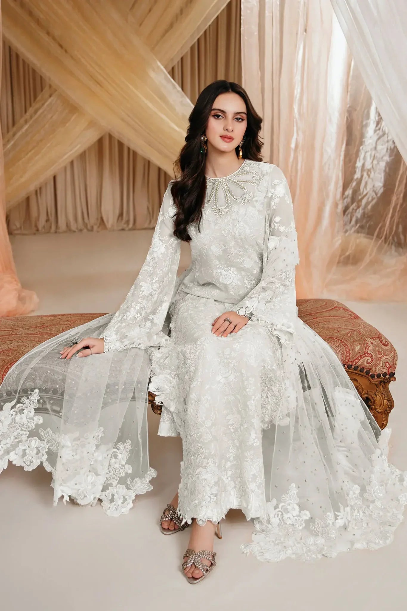 “Divine Whisper” is an absolute stunner, meticulously crafted on a gorgeous ivory canvas. This exquisite ensemble features a gorgeous neckline adorned with intricate floral embroidery, enhanced by hand embellishments of gorgeous pearls, beads, and crystals, creating a show-stopping allure. Completing this enchanting set is a delicate embroidered net dupatta, elegantly finished with floral borders—a dazzling masterpiece.