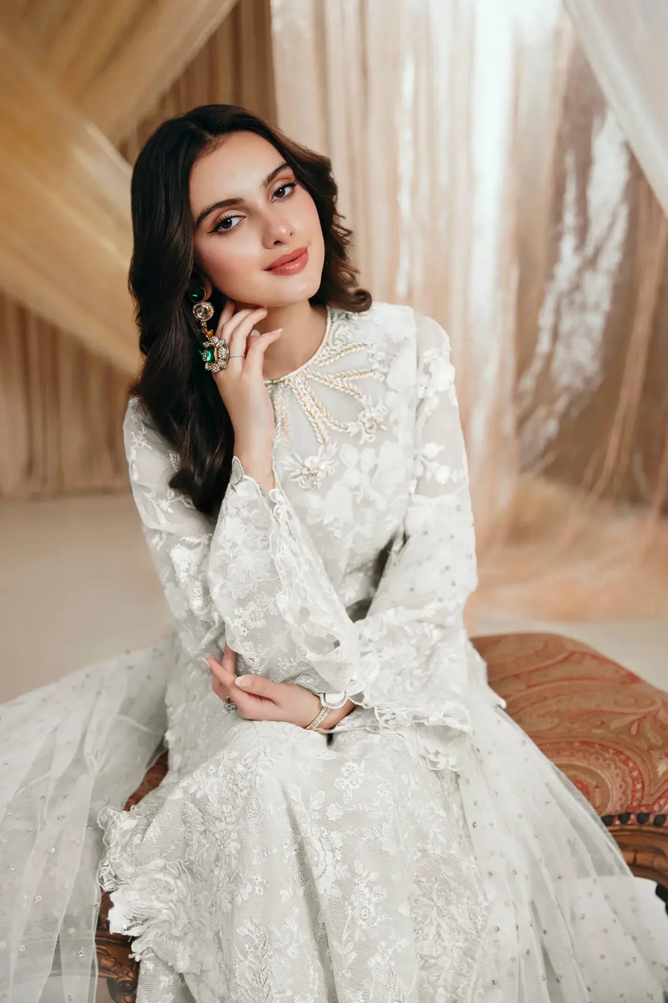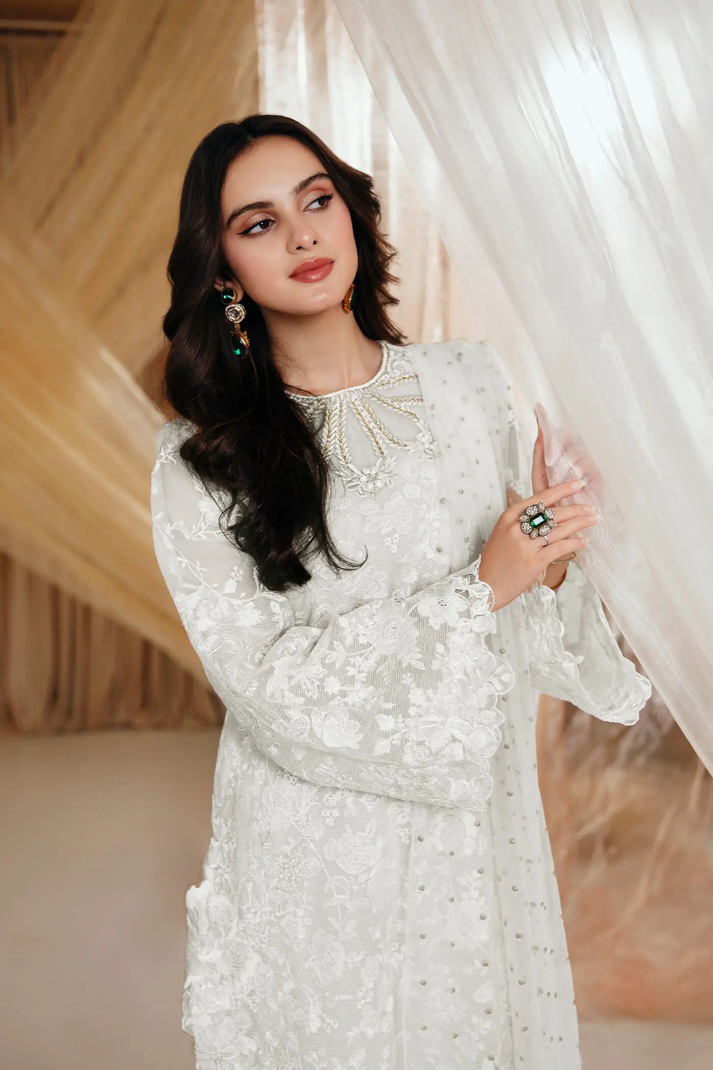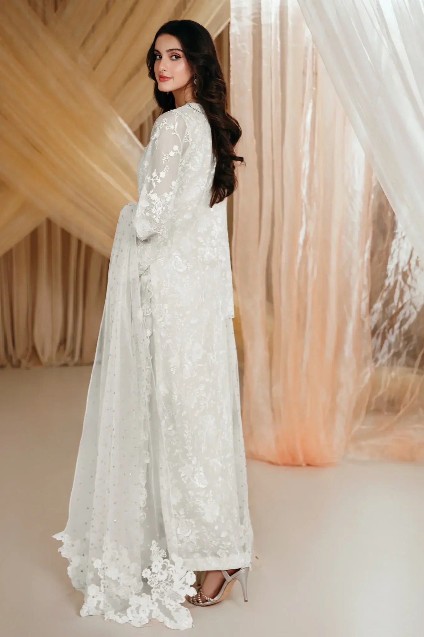 “Divine Whisper” is an absolute stunner, meticulously crafted on a gorgeous ivory canvas. This exquisite ensemble features a gorgeous neckline adorned with intricate floral embroidery, enhanced by hand embellishments of gorgeous pearls, beads, and crystals, creating a show-stopping allure. Completing this enchanting set is a delicate embroidered net dupatta, elegantly finished with floral borders—a dazzling masterpiece.