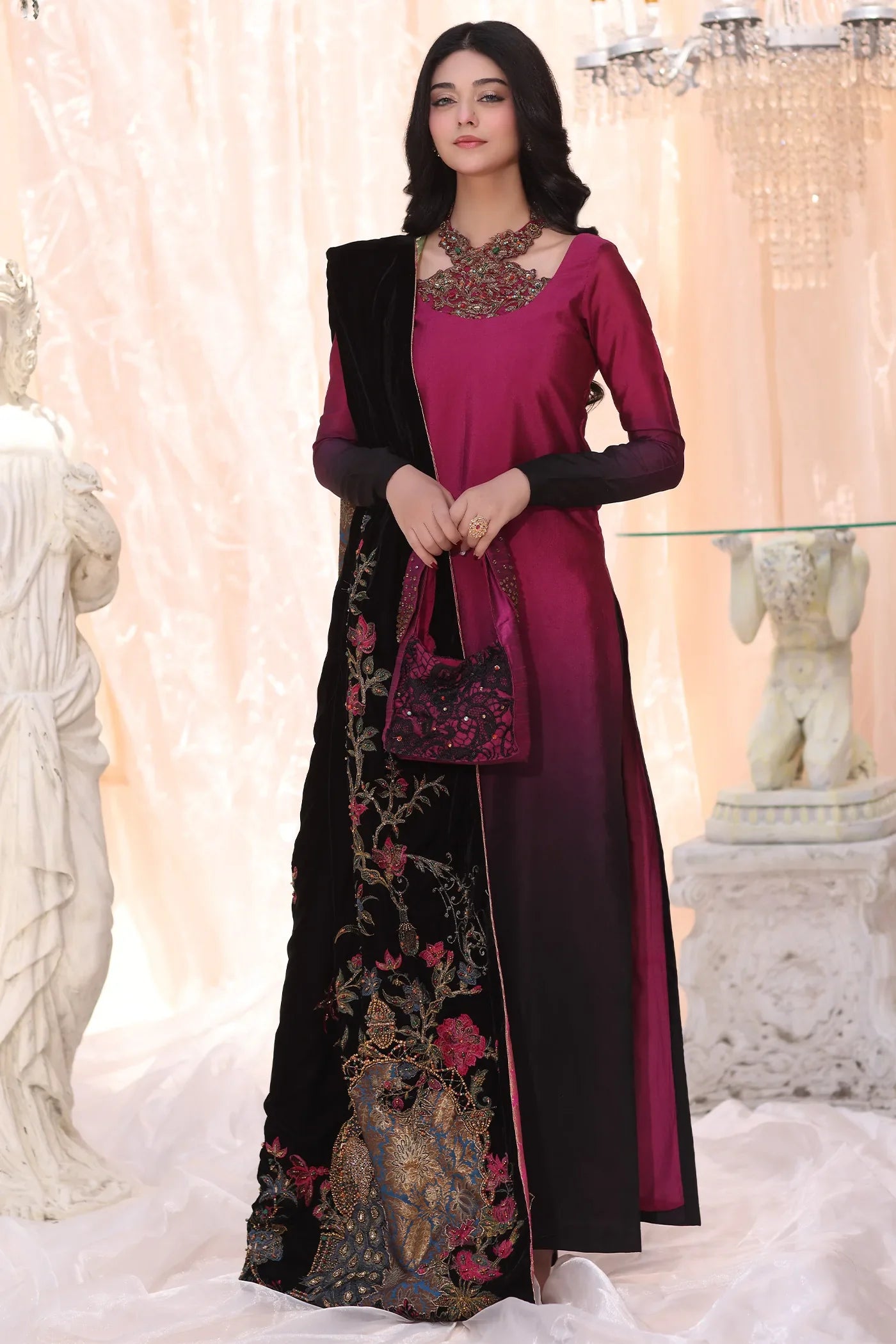 Musferah Saad introduces "Divine Fauna," an exquisite creation showcasing couture hand-work on sumptuous black velvet. This luxurious piece features a contrasting color lining, elevating its bold design.Mughal-inspired arches crafted from hand-patched Khimkhab, surrounded by intricate resham, stones, beads, shells, pipes, tilla, and shimmering Swarovski crystals. The mesmerizing arches, along with couture depictions of peacocks and deer, pay homage to Mughal grandeur, making this shawl a true statement piece.