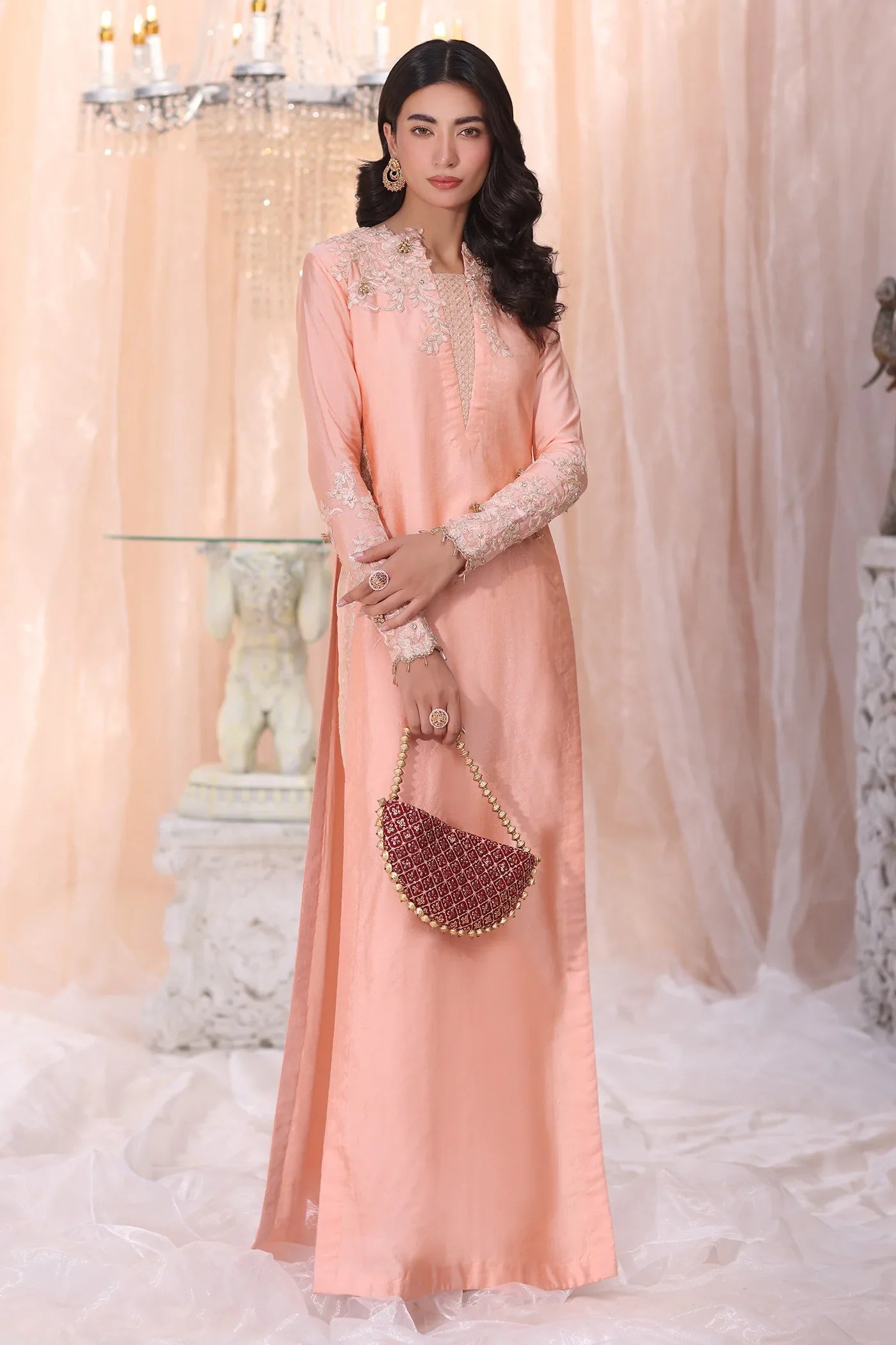 Lavishly adorned with sequins, Swarovski crystals, Resham embroidery, and colorful crystal stones, this shawl exudes elegance and sophistication. A printed lining adds depth and refinement to the overall design. Paired with a flowing long shirt, “Irish Rose” showcases a beautifully detailed floral neckline, adorned with delicate bead embellishments that add a touch of grace. The sleeves are bordered with exquisite tissue, embellished with sequins and finished with sparkling crystal details for added glamour.