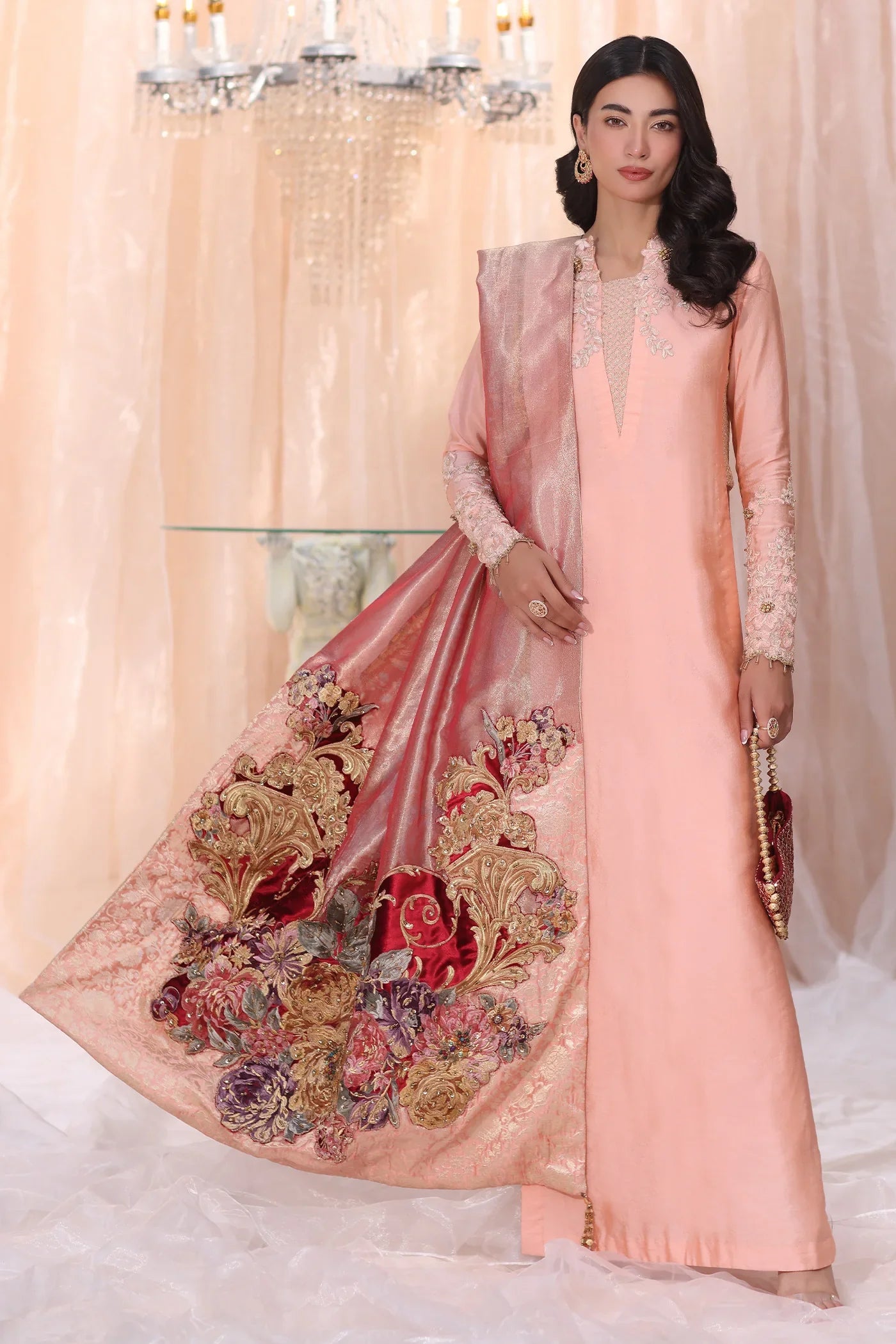 Musferah Saad’s “Irish Rose” is a breathtaking ensemble crafted from dreamy Tissue and luxurious Khimkhab. This exquisite shawl artfully blends bold floral motifs with intricate baroque details, creating a mesmerizing visual masterpiece. The pallu presents a stunning composition of florals and baroque elements, enriched by opulent Khimkhab borders.