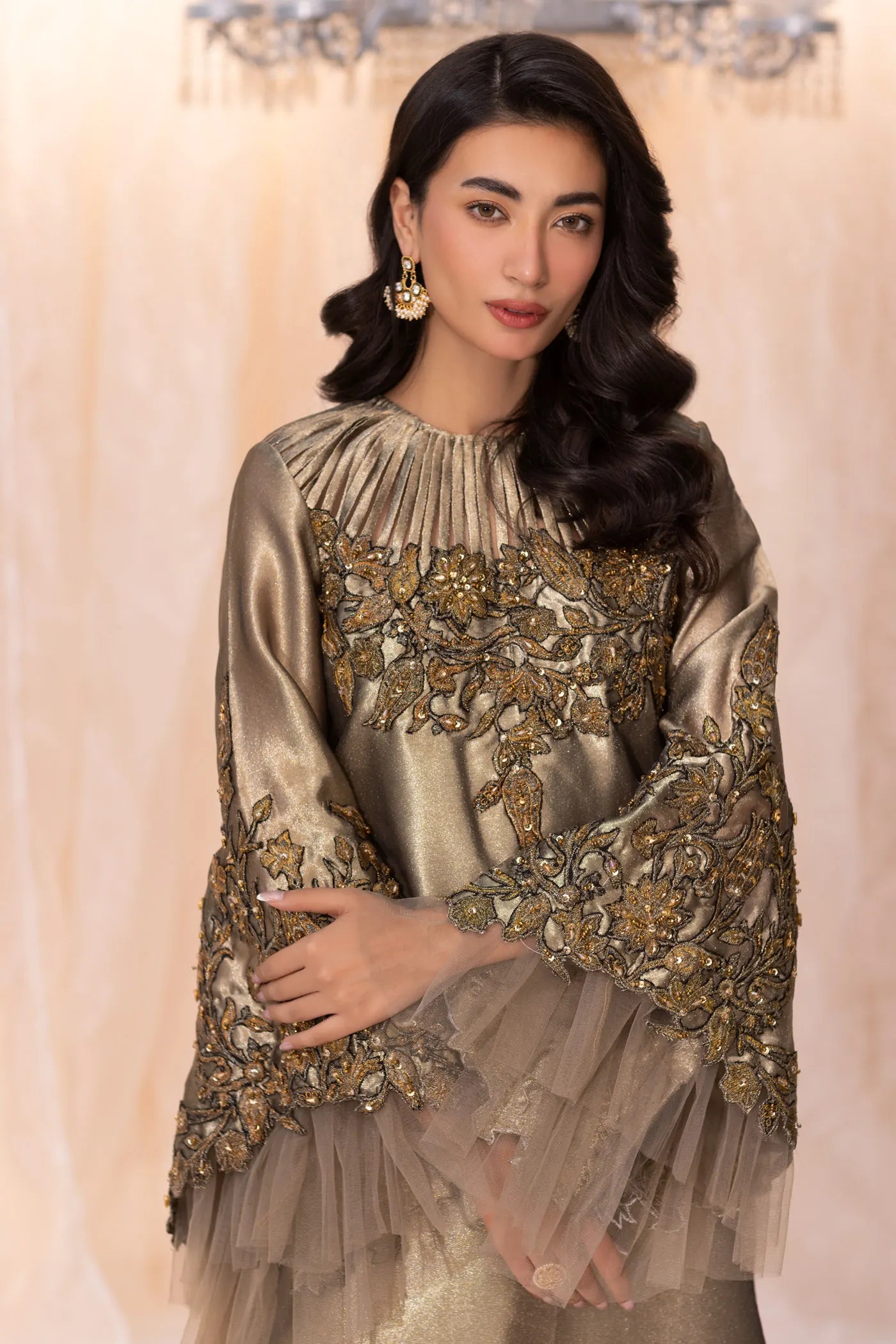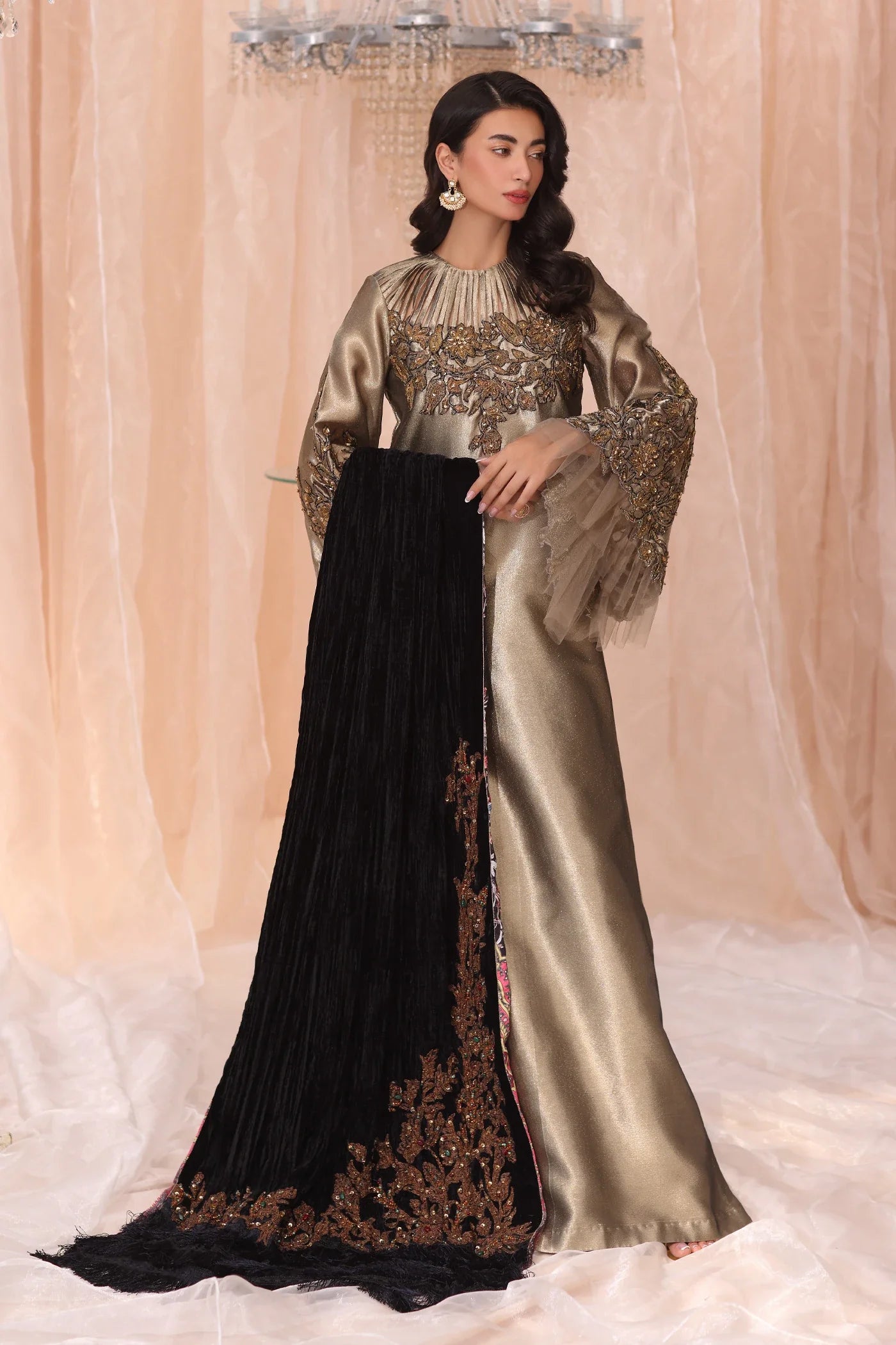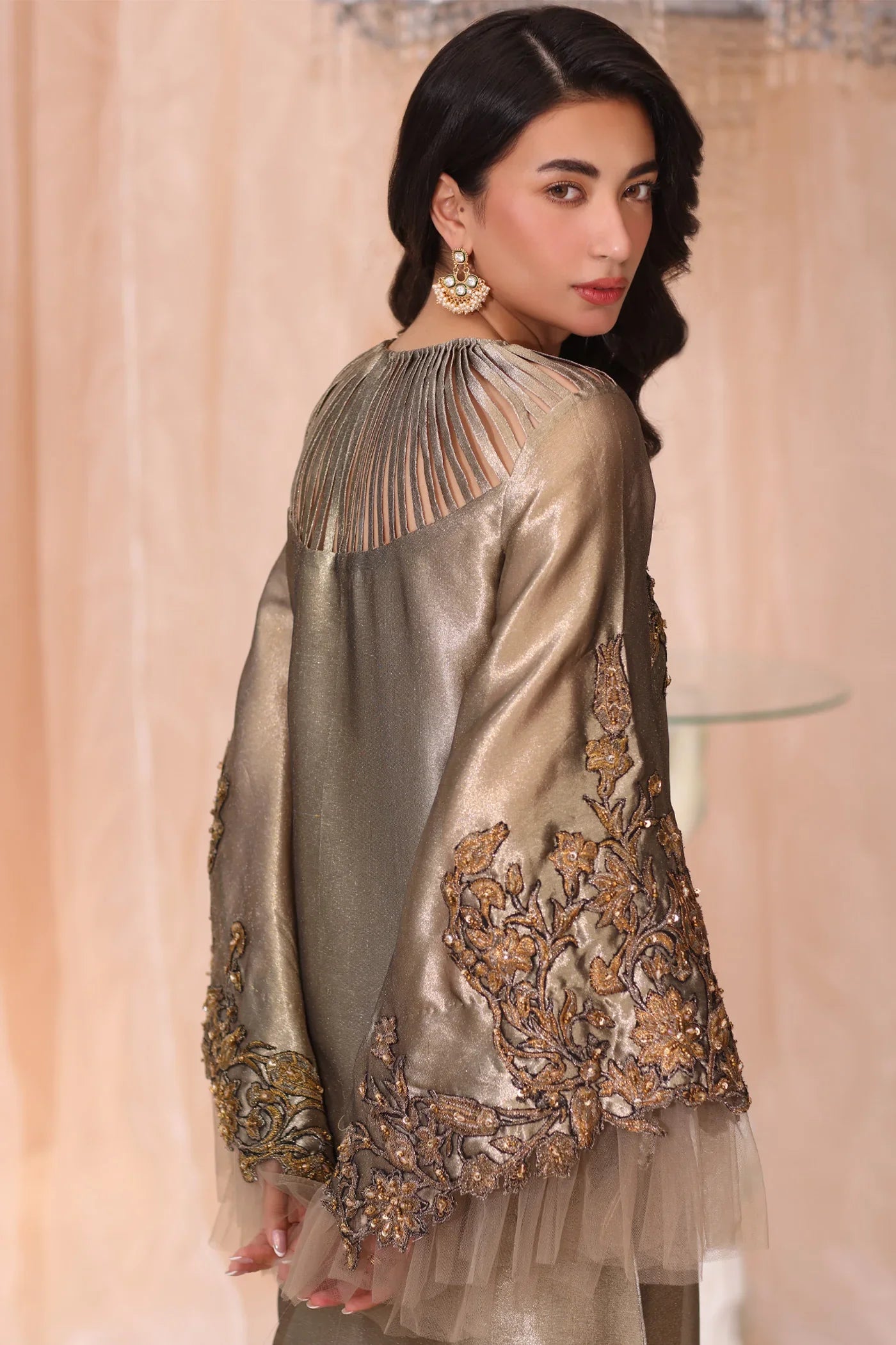 This exquisite piece features a luxurious kaftan with beautifully stitched details on the neckline and sleeves, highlighting its elegant design. The heavy embroidered flared sleeves with delicate pleated net trims are a statement in themselves, adorned with intricate antique tilla embroidery. Embellished with beads, sparkling Swarovski crystals, tubes, and sequins, this kaftan radiates chic couture.