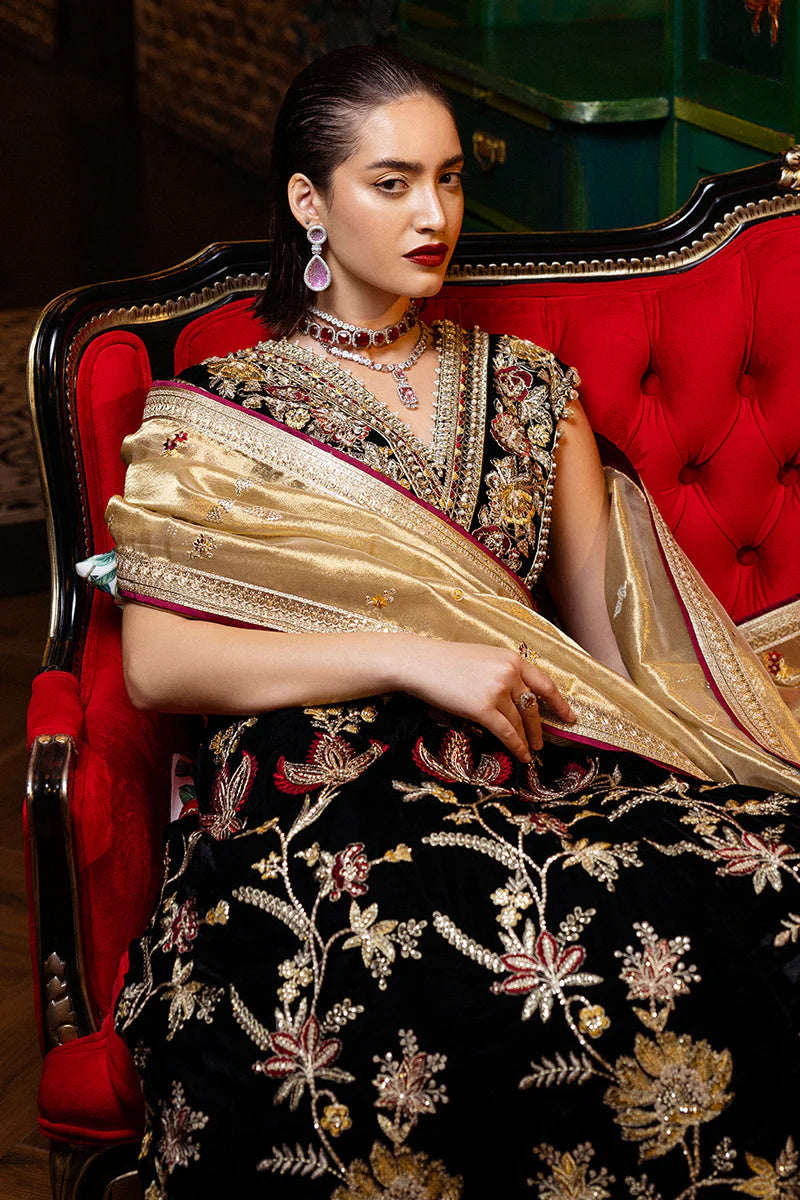 Embroidered, sequinned and hand embellished velvet for front yoke